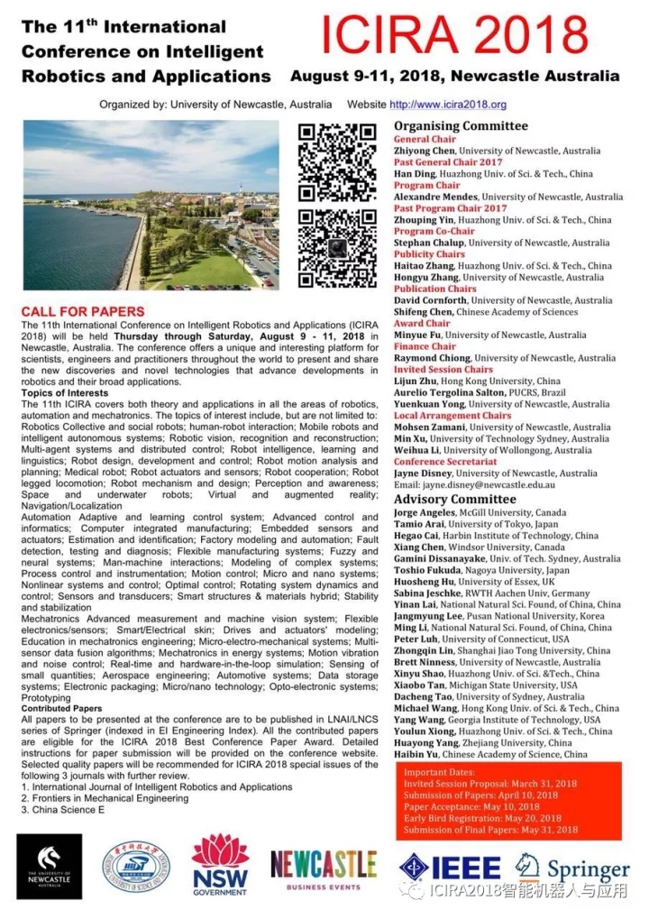 第十一届智能机器人与应用国际会议(The 11th International Conference on Intelligent Robotics and Applications)得到了中国科学院熊有伦院士与丁汉院士的大力倡导和支持,将于2018年8月9-11日在美丽的澳大利亚海滨城市纽卡斯尔举行。这次会议将为来自全球的科学家、工程师及相关专家学者提供一个独特而富有魅力的交流与合作的平台,旨在宣传和推广推动机器人技术及其应用发展的新发现和新技术。本次会议主题包括机器人技术、自动化和机电一体化的理论与应用等相关领域(详细内容参见ICIRA2018会议网站:www.icira2018.org)。同时,本次会议接收的所有论文将通过Springer的LNAI/LNCS系列进行出版(EI收录),其中高质量的论文将有资格参选ICIRA2018最佳会议论文奖。