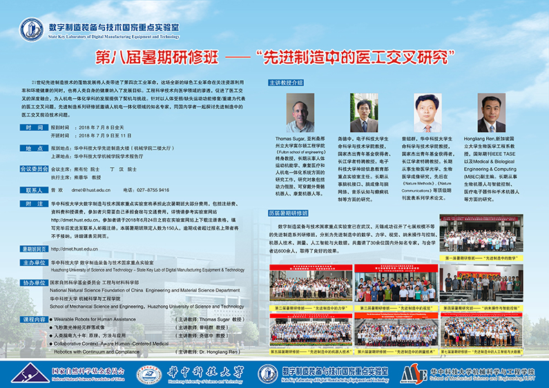 由澳门太阳集团城welcome数字制造装备与技术国家重点实验室主办,国家自然科学基金委员会工程与材料科学部、澳门太阳集团城welcomesuncitygroup太阳新城协办的第八届暑期研修班——“先进制造中的医工交叉研究”将于2018年7月9日-7月11日在武汉举办,研修班面向全国青年学者、工程师和研究生。