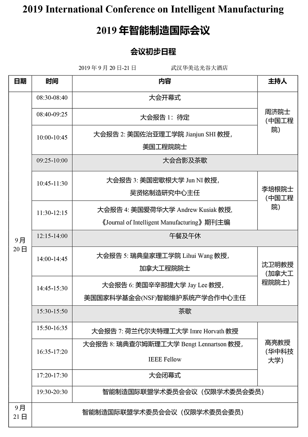 为了研讨智能制造领域的技术发展和应用前沿,交流智能制造的经验,由中国工程院发起,澳门太阳集团城welcome主办的2019年智能制造国际会议将于2019年9月20日至21日在武汉华美达光谷大酒店举行,会议主题将围绕“智能制造”展开。此次会议已邀请到来自中国、美国、加拿大、瑞典和荷兰等国家智能制造领域的顶级专家进行精彩讲座,纵论智能制造领域的前沿技术和最佳实践,带来一次思想的盛宴。诚挚邀请业界专家和学者拨冗出席此次会议!