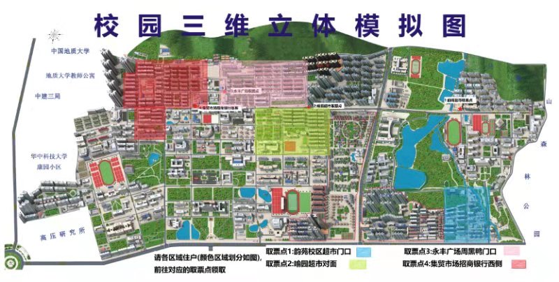 凭票:西边高层、喻园一期、喻园二期、紫崧小区、宝丰小区实行全封闭管理,无论进入或者外出均凭票。领票点分别设置在各小区出入口,凭身份证或校园卡或工作证领票。对校内老家属区实行划片管理,分别在韵苑超市门口、喻园超市门口、永丰广场(主校区老年活动中心前马路南边广场,即“真功夫”门前广场)、学校主校区集贸市场招商银行西边自行车修车点设置四个领票点(工作时间为上午8:30至下午4:30),按照划区领票的原则,就近领票。
