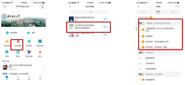 手机端:登录学习通APP进入首页(参看《澳门太阳集团城welcome本科网络教学平台教师使用手册》),选择培训课程,选择课程并报名,课程中最新章节将准时开放,点击进入最新章节可参与直播。