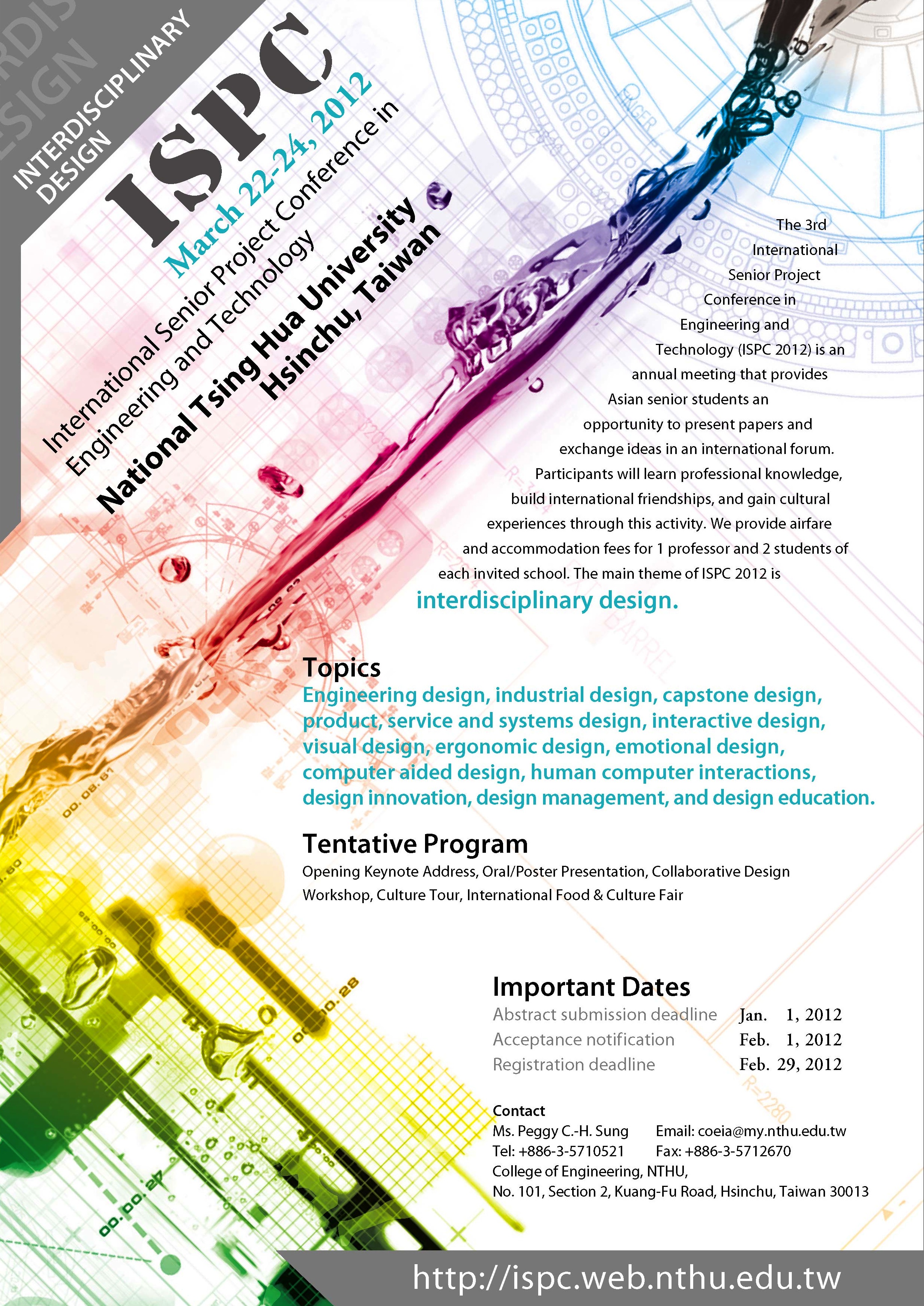 2012年工程与技术毕业设计国际会议(International Senior Project Conference in Engineering and Technology, ISPC)将于2012年3月22日到24日在台湾新竹(台湾清华大学)举行。会议网址:http://ispc.web.nthu.edu.tw