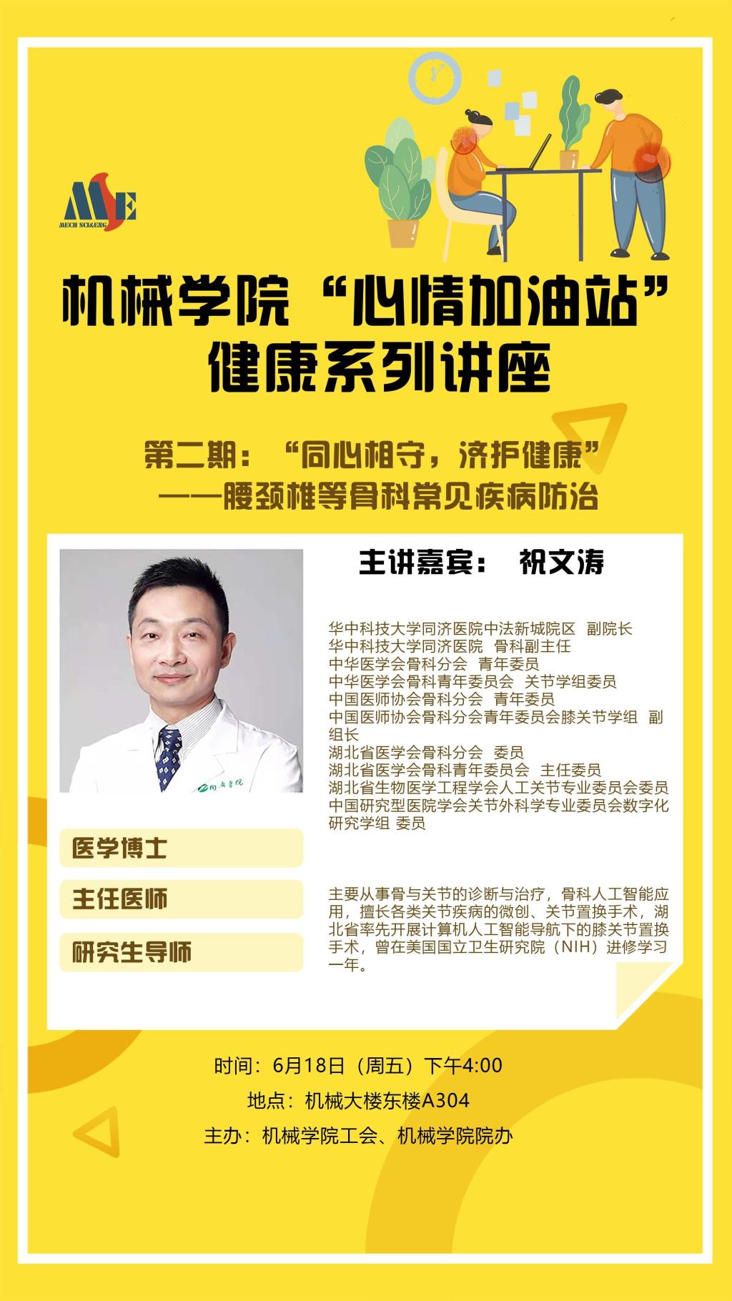此次邀请了同济医学院中法新城院区副院长、同济医学院骨科副主任祝文涛为大家讲解腰颈椎等骨科常见疾病防治的相关知识,欢迎广大师生届时积极参加!