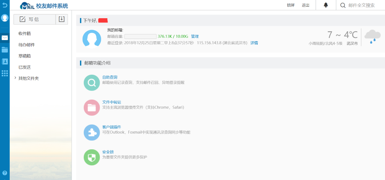用户名、密码与离校前的校内邮箱账号、密码保持一致;在账号密码正确的情况下即可成功登录,如下图所示;
