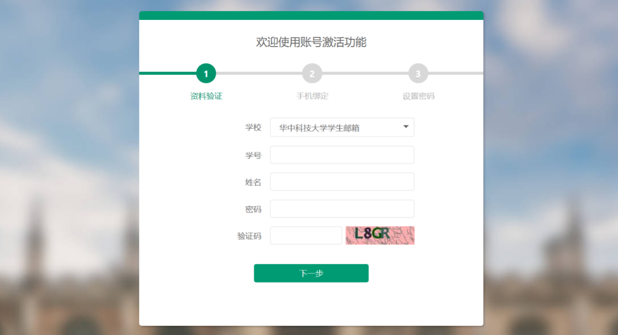 第三步,激活邮箱过程中会提示您输入学号、姓名以及密码(此密码为您的学校电子邮箱(username@hust.edu.cn)的密码,如果您忘记密码需要将身份证原件、学号、姓名等相关信息发送邮件至ncs@hust.edu.cn进行密码找回),如下图所示;